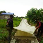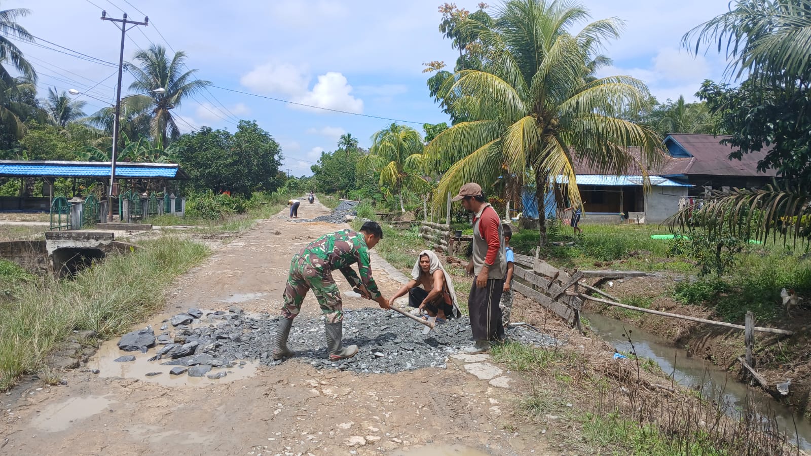 Sambas – Satgas TNI Manunggal Membangun Desa (TMMD) Reguler ke-126 Kodim 1208/Sambas bersama warga melaksanakan kegiatan gotong royong menimbun jalan yang berlubang di lokasi sasaran TMMD, Rabu (15/10/2025).
