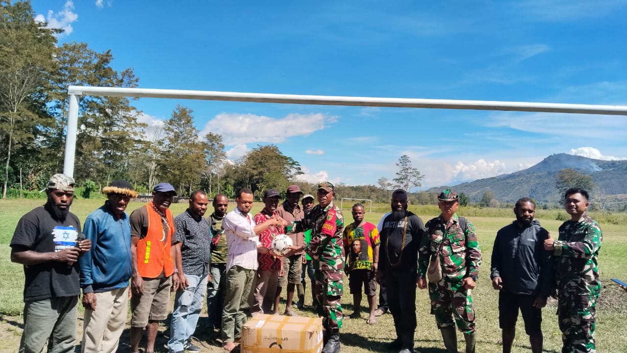 Wamena – Dalam rangka mendukung pengembangan potensi generasi muda dan mempererat tali persaudaraan dengan masyarakat, Satgas TMMD Ke-126 Kodim 1702/Jayawijaya menyerahkan bantuan berupa bola dan jaring gawang kepada pemuda Kampung Algonik, Distrik Piramid, Kabupaten Jayawijaya. Jumat (17/10/2025).
