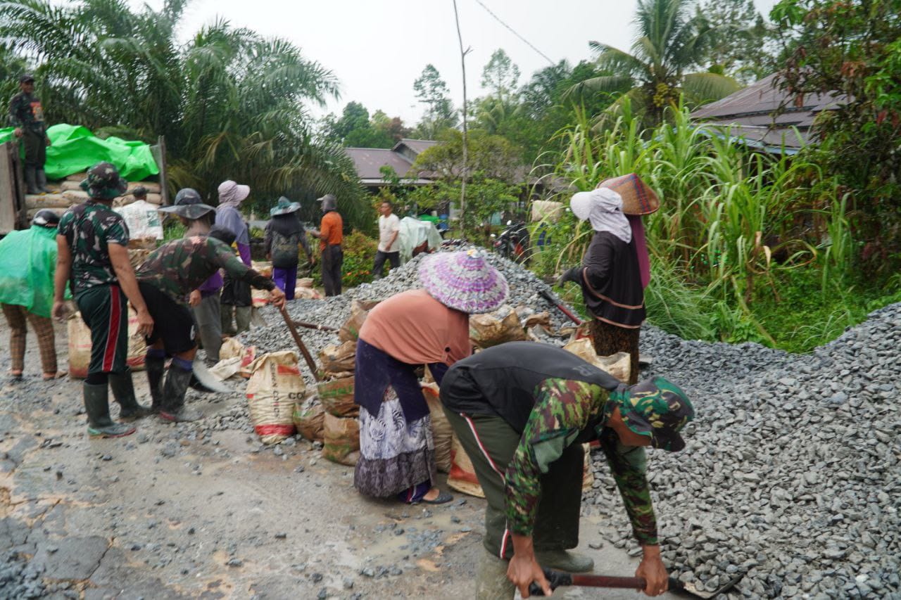 Sambas, 18 Oktober 2025 — Meski cuaca tidak menentu, semangat anggota Satgas TNI Manunggal Membangun Desa (TMMD) ke-126 Kodim 1208/Sambas tidak surut dalam melaksanakan tugasnya. Hari ini, para prajurit bersama warga bergotong royong menyiapkan material batu yang akan digunakan untuk pekerjaan rabat beton di lokasi TMMD.