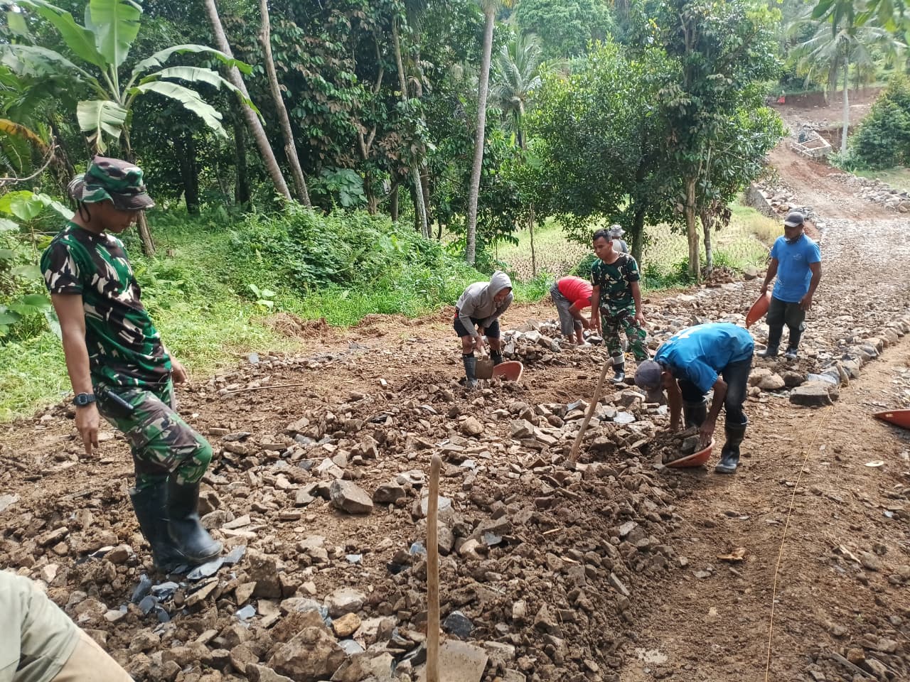 Kegiatan ini dilaksanakan secara gotong royong antara anggota TNI dan masyarakat setempat. Terlihat di lapangan, para personel Satgas bahu-membahu bersama warga memindahkan batu, meratakan tanah, dan menata material demi mempercepat penyelesaian pengerasan jalan yang menjadi akses vital bagi masyarakat desa.