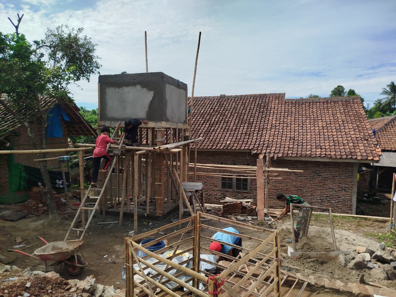Dengan memanfaatkan bahan material lokal serta struktur penyangga dari bambu, anggota Satgas TMMD bekerja dengan penuh kehati-hatian dan ketelitian. Salah satu anggota Satgas terlihat sedang melakukan proses pelapisan dinding bak menggunakan adukan semen, sementara yang lain melakukan pengecekan kekuatan struktur dari atas tangga bambu. Semua pekerjaan dilakukan secara bergotong royong bersama warga desa, mencerminkan semangat kebersamaan dan kemanunggalan TNI dengan rakyat.