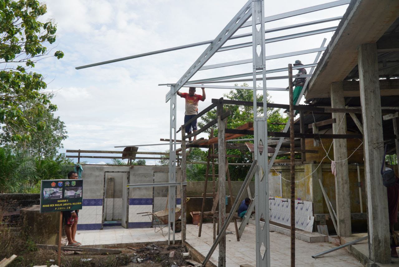 Satgas TMMD ke-126 Kodim 1208/Sambas Lanjutkan Pemasangan Kerangka Baja MCK Masjid Jami’atul Muslimin
