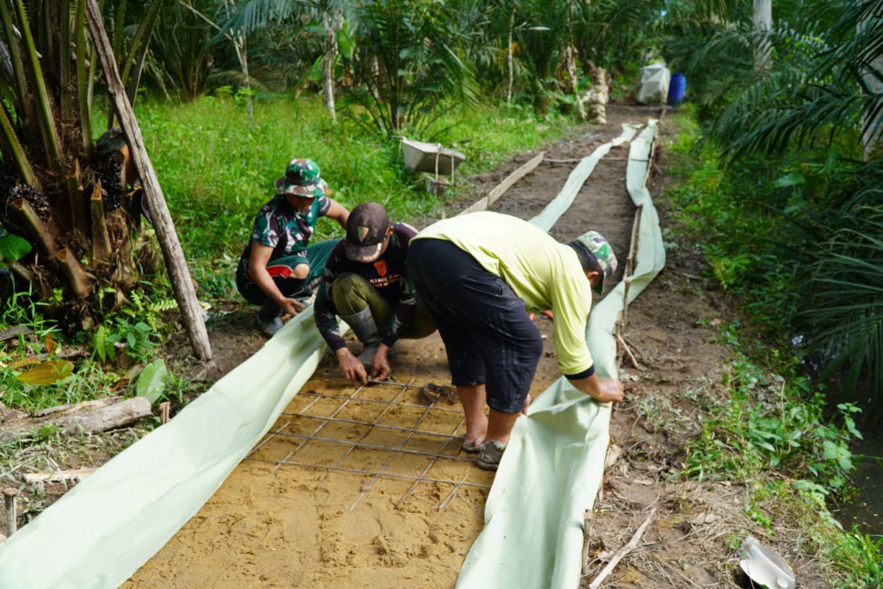 Pemasangan mal dan plastik ini bertujuan untuk menjaga kualitas hasil pengecoran agar rapi dan kuat sesuai standar teknis yang telah ditetapkan. Dengan semangat gotong royong, anggota Satgas dan masyarakat bahu-membahu menyelesaikan pekerjaan meskipun di bawah terik matahari.