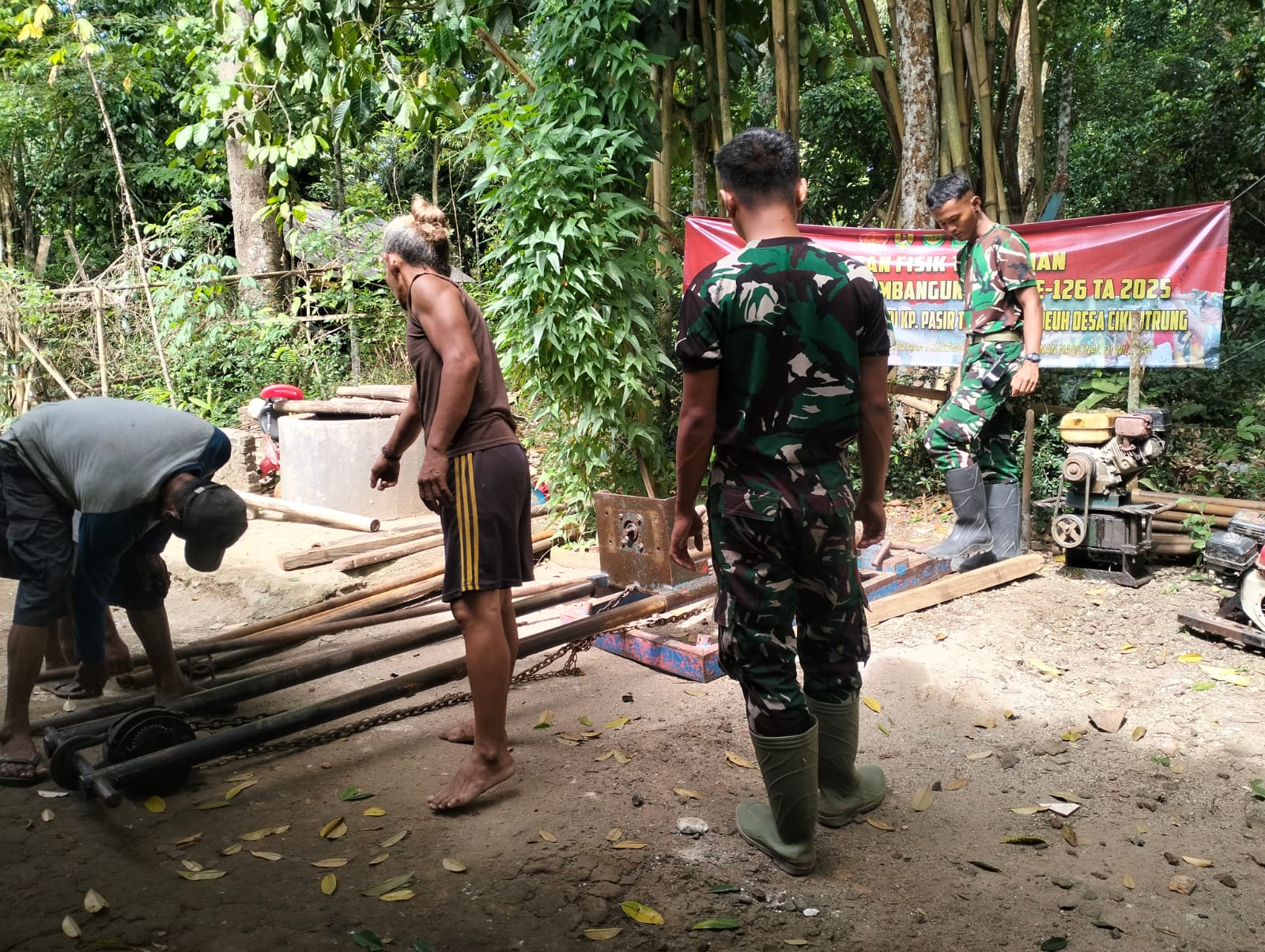 Pandeglang – Semangat TNI Manunggal Membangun Desa (TMMD) ke-126 Kodim 0601/Pandeglang terus menggema di tengah masyarakat. Pada hari ke-19 pelaksanaan program TMMD, anggota Satgas bersama warga kembali melaksanakan kegiatan pendampingan pengeboran sumur bor titik ke-4 yang berlokasi di Kampung Pasir Talun RT 02 RW 04, Desa Cikentrung, Kecamatan Cadasari, Kabupaten Pandeglang. Hingga saat ini, progres pekerjaan telah mencapai 50 persen.