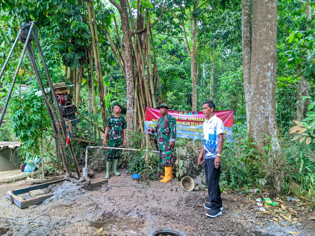 Anggota Satgas TMMD terlihat bekerja sama dengan masyarakat dan perangkat desa dalam proses pengeboran. Dengan menggunakan peralatan sederhana, namun penuh semangat dan kekompakan, para prajurit TNI terus memastikan agar pengeboran berjalan lancar dan mencapai kedalaman yang sesuai untuk mendapatkan sumber air yang baik.