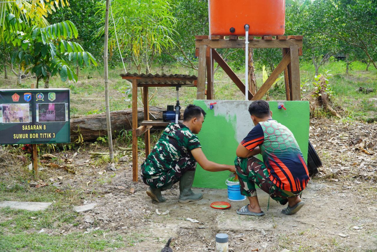 Sambas – Satgas TNI Manunggal Membangun Desa (TMMD) Reguler ke-126 Kodim 1208/Sambas terus menunjukkan semangat dan kepedulian terhadap hasil pembangunan yang telah mereka kerjakan di Desa Ratu Sepudak, Kecamatan Galing, Kabupaten Sambas. Salah satu kegiatan yang dilakukan kali ini adalah pengecatan bangunan penampungan air sumur bor hasil program TMMD.