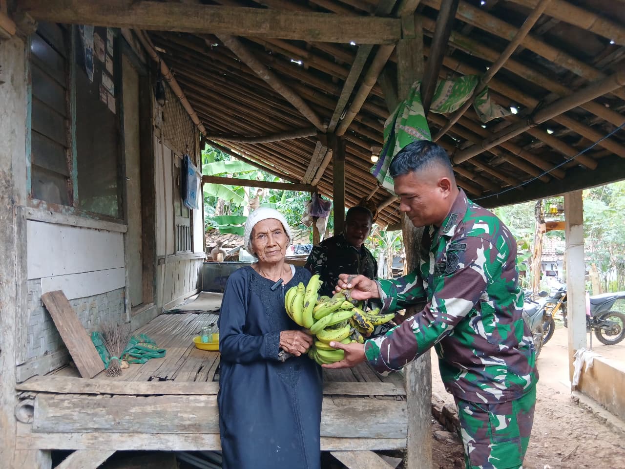 Dalam momen yang penuh makna tersebut, Ibu Ecih menyerahkan buah pisang hasil kebunnya sebagai simbol rasa syukur dan penghargaan kepada para prajurit yang telah bekerja tanpa kenal lelah membantu masyarakat. Dengan senyum tulus, ia bersama salah satu anggota Satgas TMMD berpose sambil mengacungkan jempol, tanda kebanggaan dan rasa terima kasih yang mendalam.