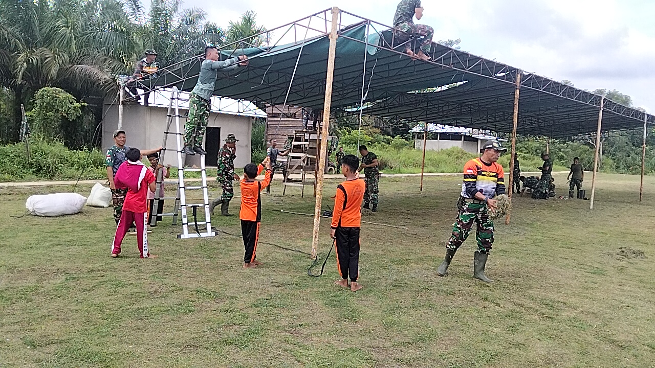 Sambas – Menjelang upacara penutupan TNI Manunggal Membangun Desa (TMMD) Reguler ke-126 Kodim 1208/Sambas, suasana gotong royong tampak di lokasi kegiatan. Satgas TMMD bersama warga, termasuk anak-anak Desa Ratu Sepudak, bahu-membahu memasang tenda yang akan digunakan untuk acara penutupan tersebut, Rabu (05/11/25).