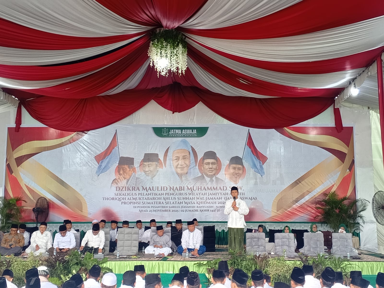 Banyuasin, sumselsembilan.id — Pelaksanaan Dzikra Maulid Nabi Muhammad SAW yang dirangkaikan dengan pelantikan pengurus wilayah Jam’iyah Ahli Thariqoh Al-Mu’tabarah Ahlussunnah Wal Jamaah (JATMA) Sumatera Selatan berlangsung khidmat dan penuh kehangatan. Acara ini dihadiri jajaran ulama, habaib, tokoh masyarakat, serta perwakilan Pemerintah Provinsi Sumatera Selatan. Minggu (23/11/2025)