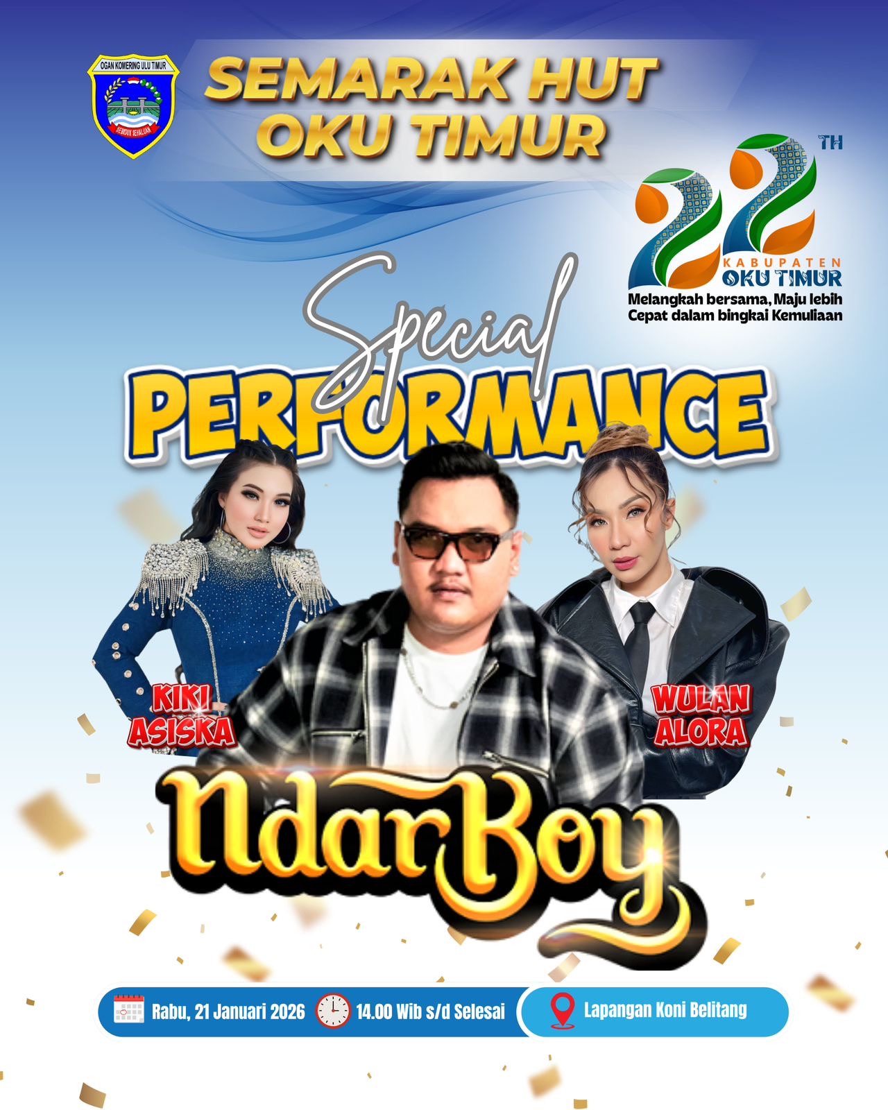 Oku Timur, sumselsembilan.id – Salah satu agenda puncak yang paling dinantikan masyarakat adalah Hiburan Rakyat yang akan digelar pada Rabu, 21 Januari 2026, bertempat di Lapangan KONI OKU Timur. Hiburan rakyat ini akan menghadirkan Ndarboy, Wulan Alora, dan Kiki Asiska, sebagai bentuk persembahan pemerintah daerah untuk masyarakat OKU Timur dalam suasana penuh kebersamaan dan kegembiraan.
