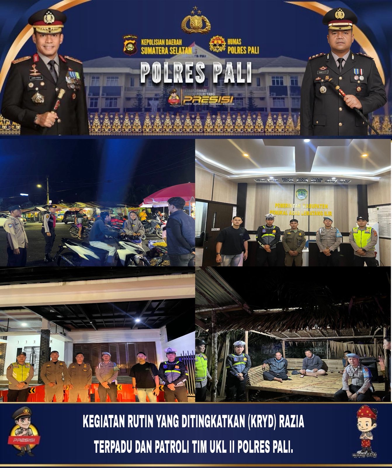 PALI, sumselsembilan.id – Dalam rangka menjaga stabilitas keamanan dan ketertiban masyarakat (Sitkamtibmas) serta keselamatan, ketertiban dan kelancaran lalu lintas (Kamseltibcarlantas), Polres Penukal Abab Lematang Ilir (PALI) melaksanakan Kegiatan Rutin Yang Ditingkatkan (KRYD) berupa razia terpadu dan patroli oleh Tim UKL II Polres PALI, Jumat malam (9/1/2026).