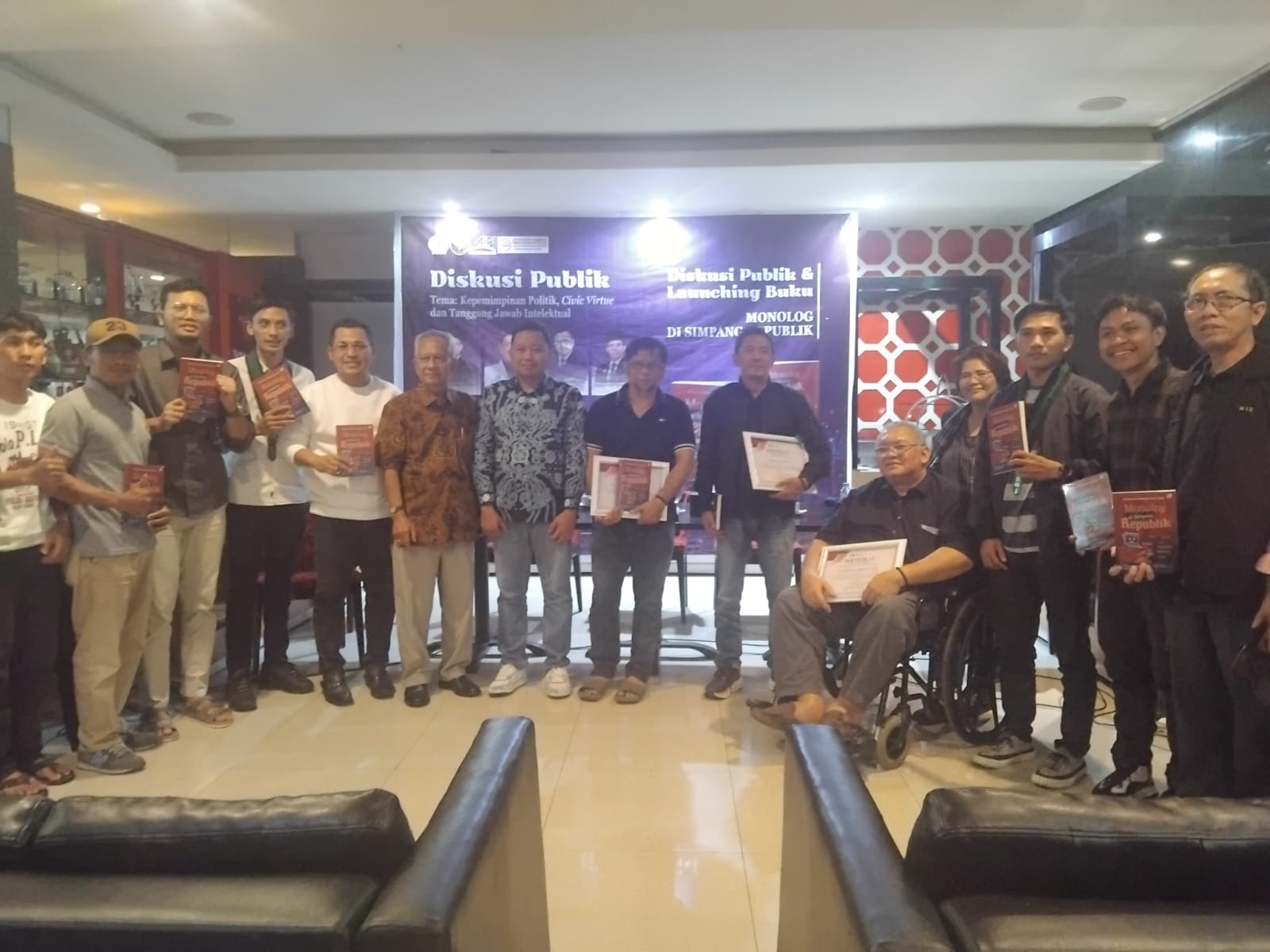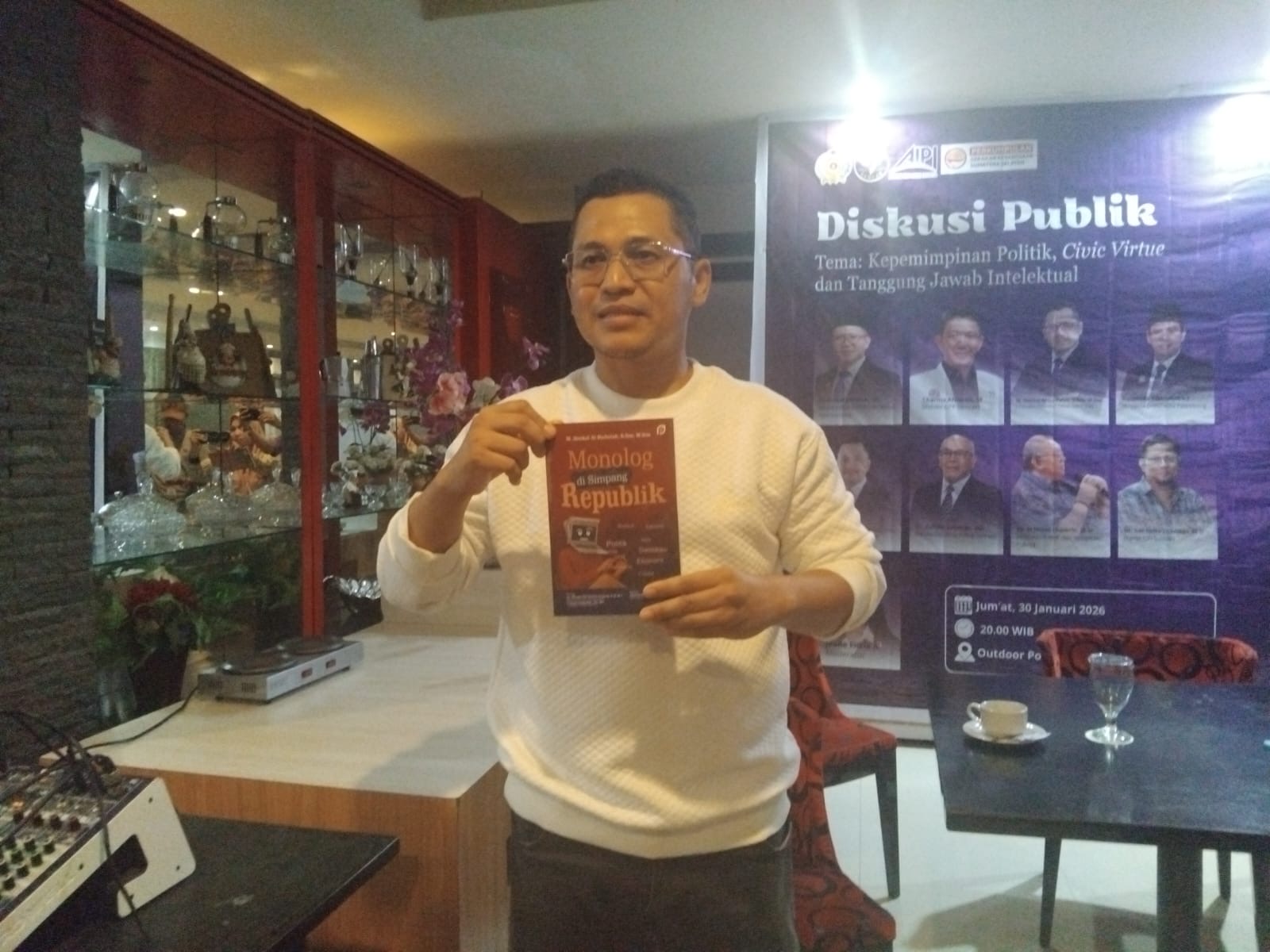 Penulis buku Monolog di Simpang Republik, M. Haekal Al Haffah, S.Sos., M.Sos., tampil sebagai narasumber utama. Turut hadir Ketua Umum DPP Gencar Charma Afrianto, SE, Ketua PDHI Sumsel Drh. Alfin Suhanda, Akademisi Ilmu Politik Dr. Zulfikri Suleman, MA, Ilmuwan Politik dan Kebijakan Publik Dr. Husni Thamrin, M.Si, serta Pengamat Politik Ade Indra Chaniago. Acara ini diikuti oleh akademisi, mahasiswa, dan masyarakat umum.