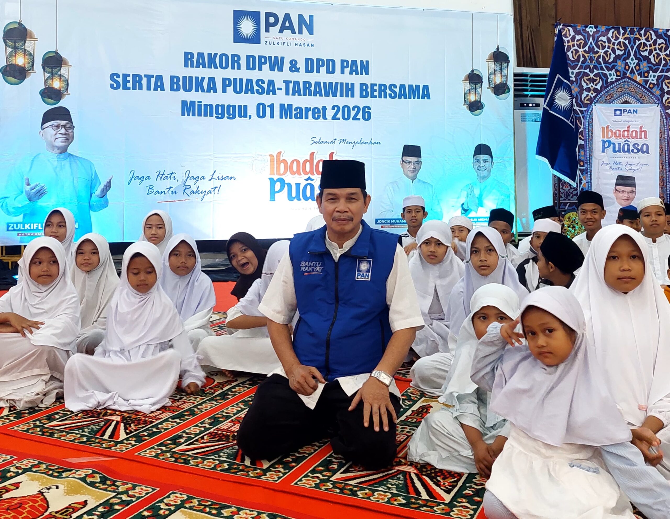 PALEMBANG, sumselsembilan.id — Jajaran pengurus PAN se-Sumsel, menggelar rapat koordinasi sekaligus buka puasa bersama atau bukber dengan anak yatim piatu dan sholat terawih berjamaah, Minggu (1/3) di Hotel Swarna Dwipa Palembang. Acara tersebut dipimpin langsung oleh Ketua DPW PAN Sumsel, Dr H Joncik Muhammad S.Si SH MM MH.