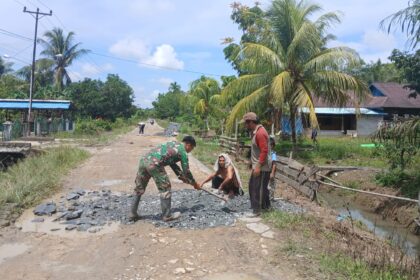 Sambas – Satgas TNI Manunggal Membangun Desa (TMMD) Reguler ke-126 Kodim 1208/Sambas bersama warga melaksanakan kegiatan gotong royong menimbun jalan yang berlubang di lokasi sasaran TMMD, Rabu (15/10...